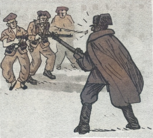 | Imagen del enfrentamiento de guerrilleros y guardia civil. Imagen coloreada y tratada con tecnología I.A. Recreación. Ilustración de © Alfonso Zapico. Alfonso Zapico (Blimea, San Martín del Rey Aurelio, Asturias, 1981) es un historietista e ilustrador español. En 2012, su novela gráfica Dublinés fue galardonada con el Premio Nacional de Cómic. Entre otros trabajos es de destacar su ambiciosa obra, La Balada del Norte. Saber más… WIKIPEDIA. |